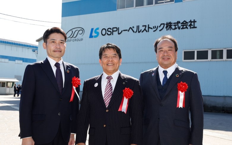 左:OSPレーベルストック 川上 中央:平尾市長 右:OSPホールディングス 松口